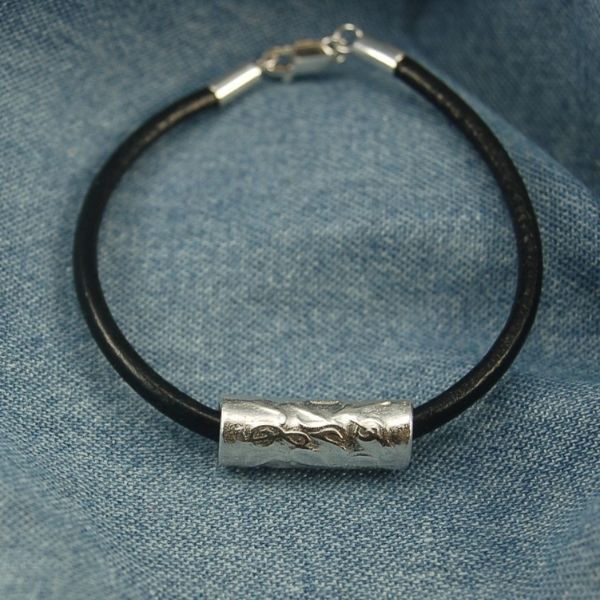 Rörpärla i finsilver med ett diskret mönster av g-klavar. Läderarmband med silverspänne går att köpa till. Det finns armband av flätat läder och av slätt läder. Pärlan är också jättefin att ha i ett halsband.